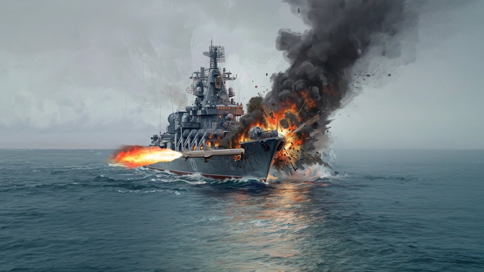Cependant, le croiseur amiral est un immense navire de 186 mètres de long (presque deux terrains de football). Il n'est pas si facile de le détruire, même coup après coup. Et là encore, le succès — les missiles ont frappé précisément les endroits les plus critiques du navire amiral : la salle des machines, le poste de commandement central de la survie du navire et la «soute» où étaient stockées les munitions antiaériennes… Cependant, l'équipage a lutté pour la survie du croiseur, et les navires à proximité se sont précipités pour aider.